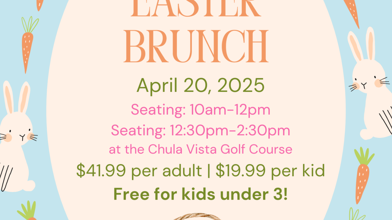 Easter Brunch and Egg Hunt Apr 20, 2025 @ 10:00 am - 2:30 pm0CommentsHop into the Easter Spirit at Chula Vista Golf Course! Celebrate Easter in style with family and friends at our annual Easter Brunch! Join us for a festive day packed with…Read More